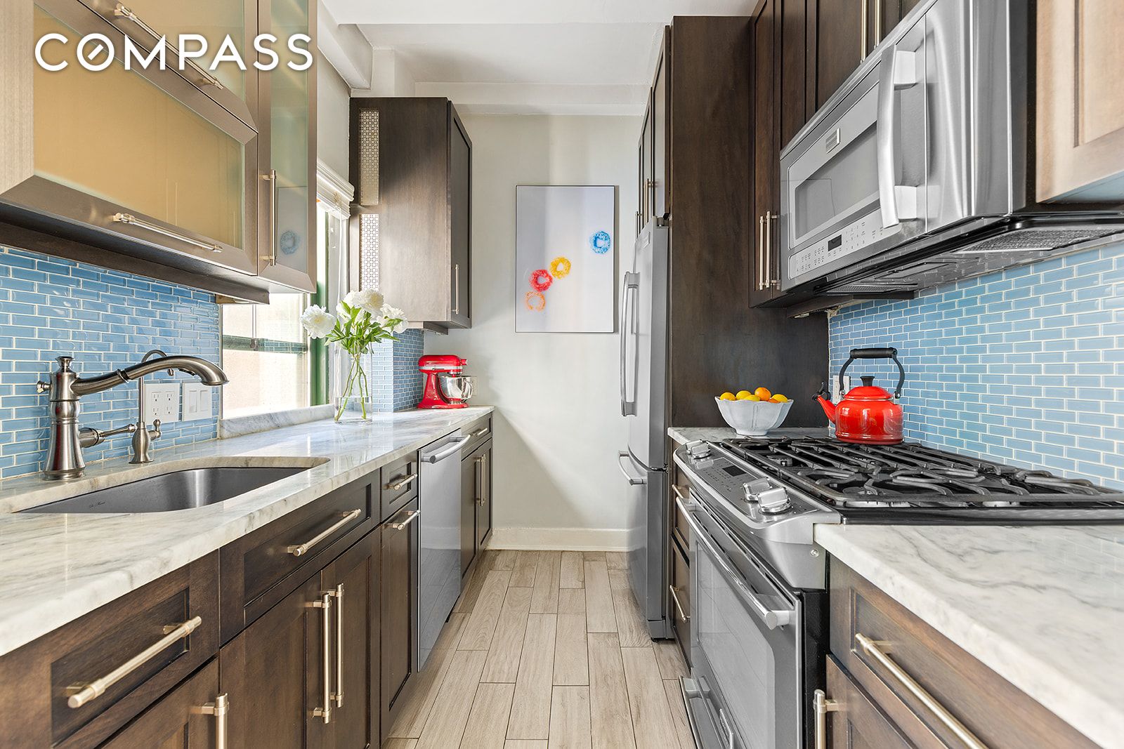 An elegant entry foyer leads to a stately formal dining room -- a unique feature of this particular 2 bedroom layout -- which is large enough to support its current configuration as a multipurpose dining space and home office. Separated by two French barn doors, the room could also serve as a prized third guest bedroom. Off the dining room is the renovated, windowed kitchen featuring beautiful quartzite countertops, stainless steel appliances, and ample cabinetry designed to extend all the way up to the 9'+ ceilings.
