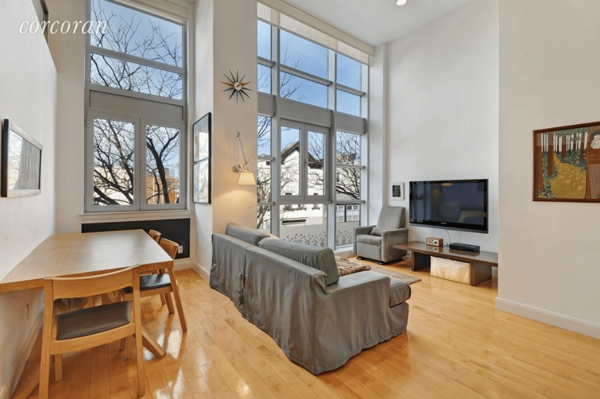 Tax abatement through 2033! This open and airy duplex at the Aria features two full bedrooms, a spacious mezzanine, 14-foot ceilings and luxurious maple hardwood floors throughout. This corner home enjoys northern exposure through oversized windows ushering in soothing light all day long. The master bedroom features an extra western exposure perfect for taking in those fabulous sunsets. The open kitchen boasts stainless steel Jenn-Air refrigerator and Bosch stove, microwave and dishwasher, ample cabinet space, and Caesarstone countertops. The beautifully-appointed windowed bathroom features Calcutta Gold marble walls and countertop, a posh WET sink, glass-enclosed shower, and deep Zuma soaking tub. Other wonderful extras include central heating and cooling, Bosch in-home laundry, exceptional closet space and video intercom. The beautiful common roof deck offers panoramic city views. The Aria is a pet-friendly, 20-unit condominium with easy access to Manhattan via the Graham L stop and just six blocks from Metropolitan G. Surrounded by fantastic restaurants and charming shops and close to Cooper and McCarren Parks.
