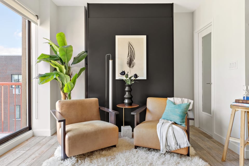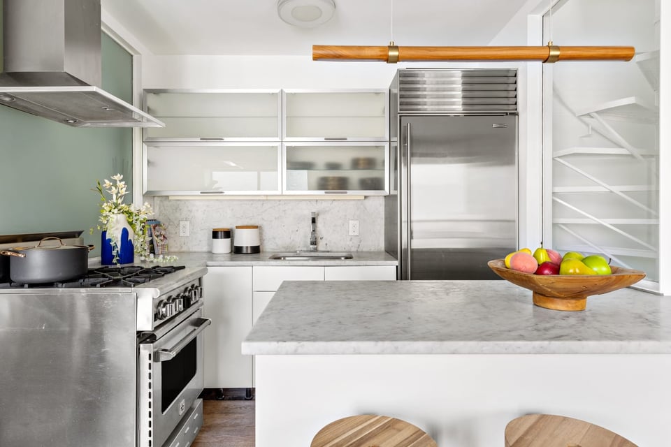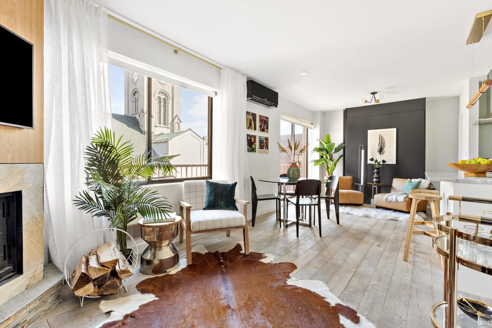Enter on the 6th floor into the great room, anchored by an open kitchen with Miele and subzero appliances and a breakfast bar, looking out into the sunny living room and balcony beyond with views of a 19th Century Church, the city to the East, and gardens below. There are wide-plank oak floors, fireside dining and seating areas, a chic guest powder room, and an elegantly concealed murphy bed if your guests stay a little longer...