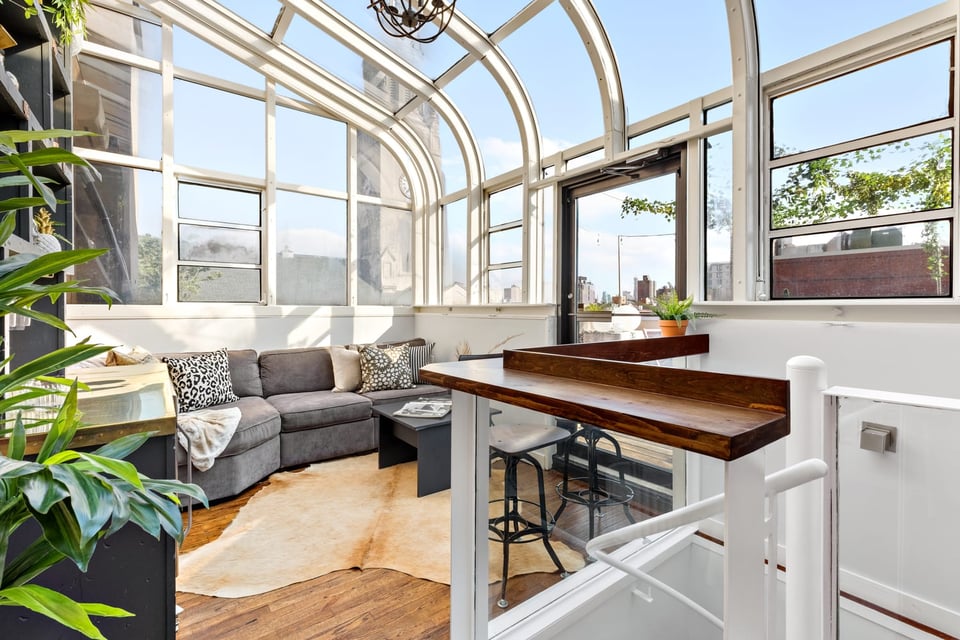 The solarium opens out onto the huge private roof terrace perfect for dining and lounging. This epic outdoor space is strung with edison lights and greenery, with views into the clocktower of the beautiful adjacent church, the village below, and sightlines to midtown and the Manhattan skyline at night. The grill is included, so your guests may never want to leave, and thankfully you have three floors to accommodate them.