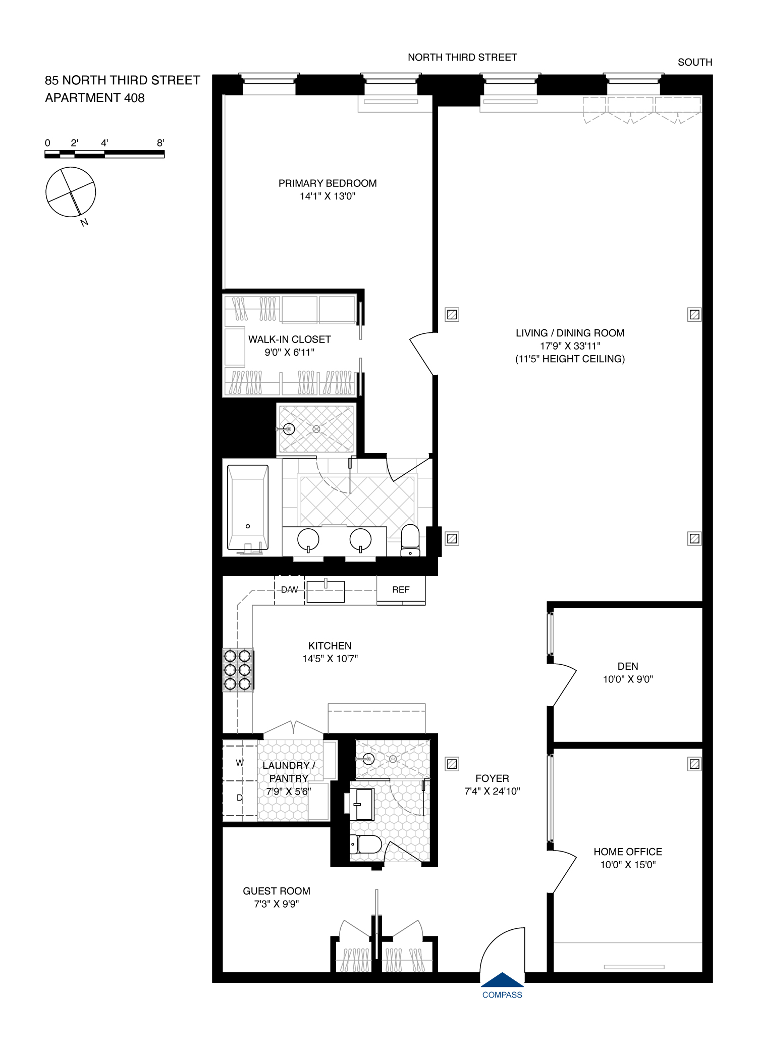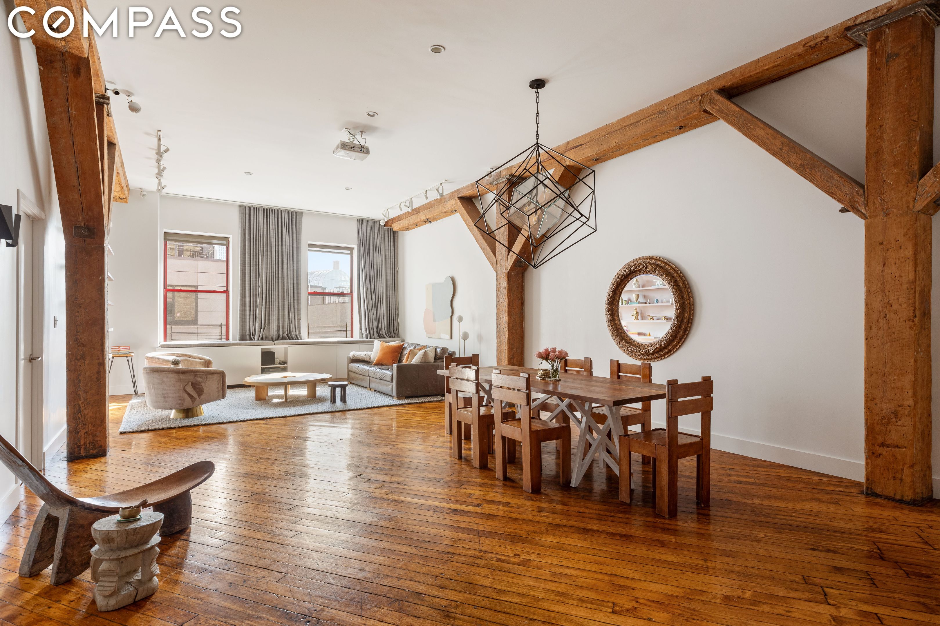 Introducing Residence 408 at the highly coveted Mill Building, a spacious 1,972 square foot original loft in the heart of Williamsburg's prime Northside. This impeccably designed home has been thoughtfully renovated with a designer's attention to detail, blending historic details with modern, updated finishes. The loft's soaring 11-foot ceilings and exposed original wood columns are complimented by recessed lighting and custom millwork throughout. The expansive living room is outfitted with a Kelly Wearstler chandelier, a custom-built movie-theater screen and projector hidden in the ceiling, and custom window seating and shelving.